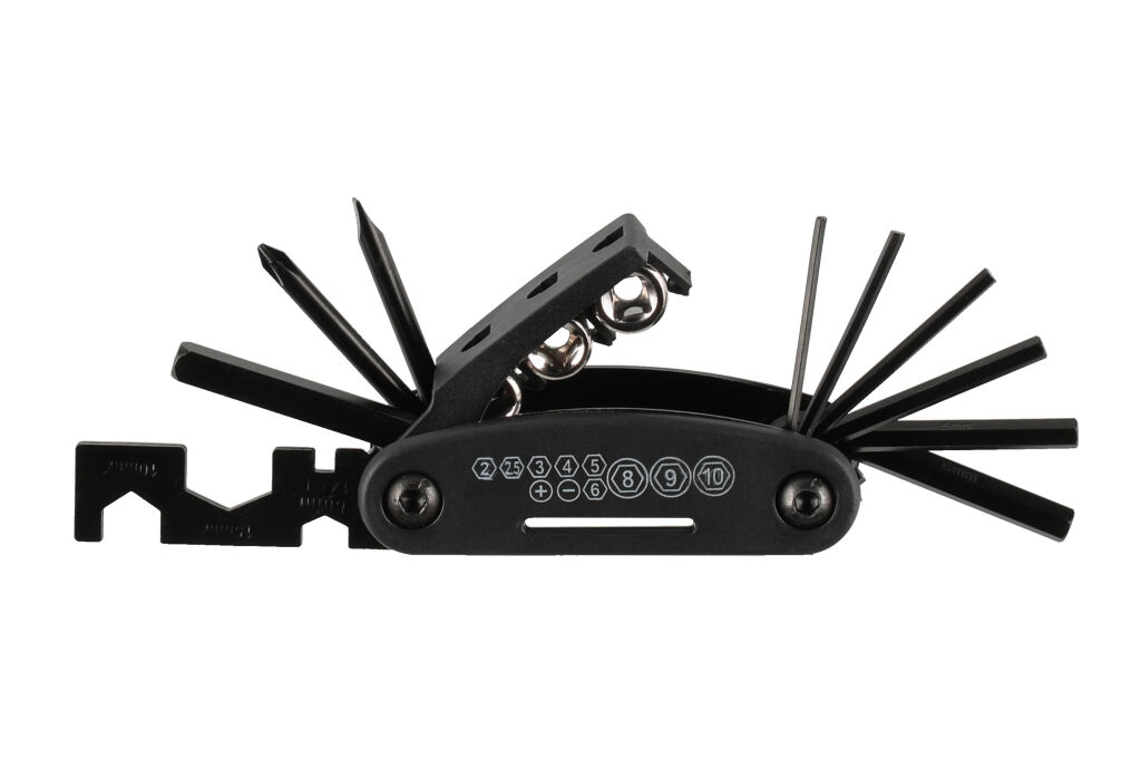 Erinomainen varuste ahkeralle pyöräilijälle. Monitoimityökalu sisältää: talttapääruuvimeisseli, ristipääruuvimeisseli, kuusiokoloavain: 2/2,5/3/4/5/6 mm, kiintoavain 8 mm, 10 mm, 15 mm, pinna-avain (koko 14GE), jatkovarsi, hylsyvain 8 mm, 9 mm, 10 mm.