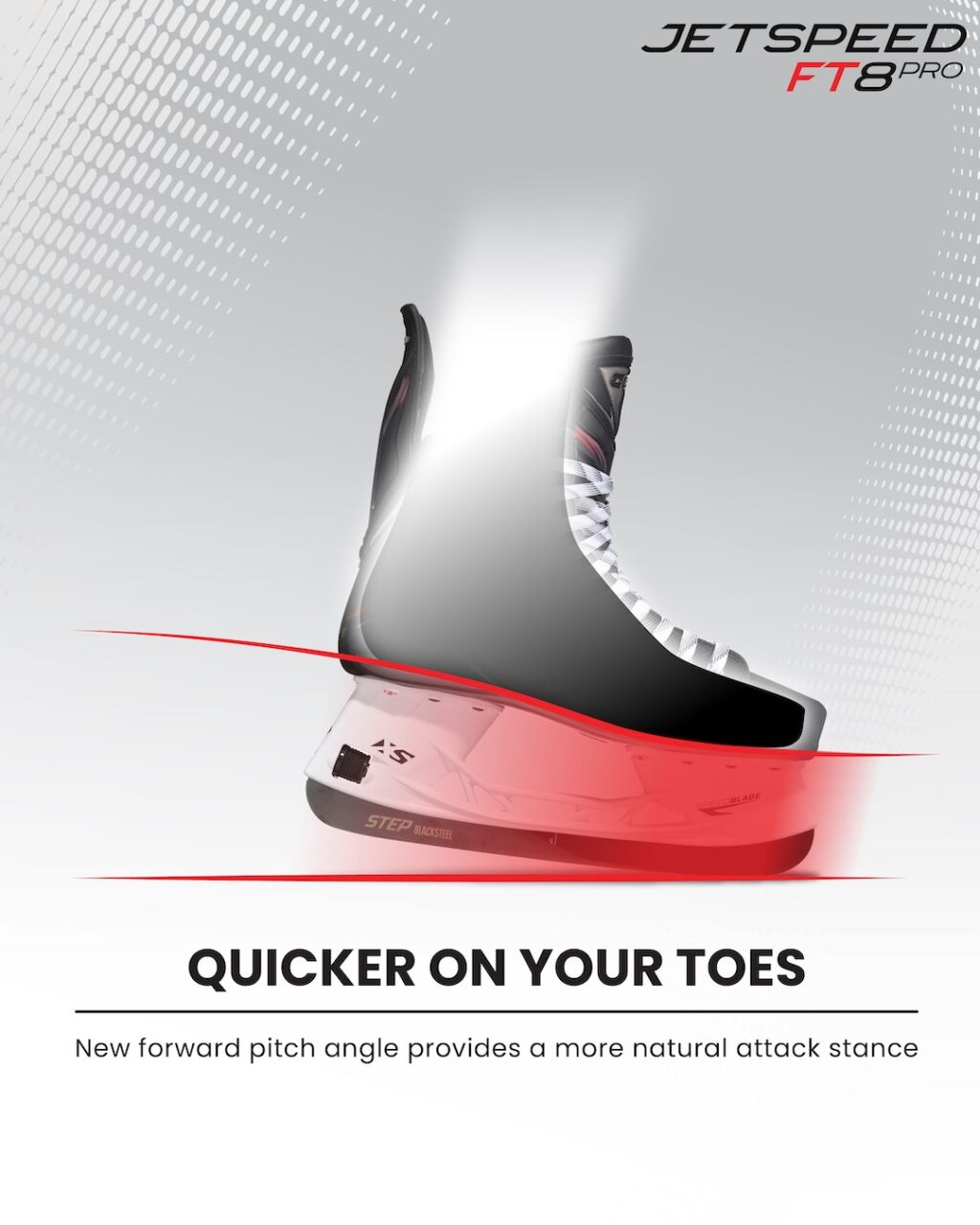Parannettu teräkulma: Uusi, etupainoinen teräkulma tarjoaa luonnollisemman hyökkäysasennon, jonka ansiosta pelaajat pääsevät nopeammin päkiöilleen ja luistelupotkuisa tulee räjähtävämpiä.