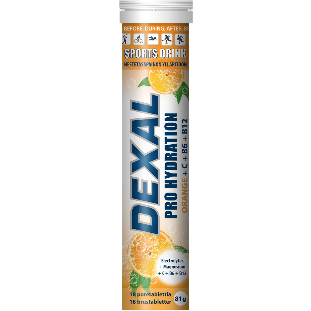 Dexal Pro Hydration Appelsiini + C+B-vitamiini poretabletti. Uuden sukupolven suorituskykyä ylläpitävä urheilujuoma treenin ajaksi. Sisältää tärkeimmät elektrolyytit neste- ja elektrolyyttitasapainon ylläpitoon. Lisää poretabletti veteen, ja juomasi on valmis minuutissa. Dexal Pro Hydration on kaloriton ja sokeriton urheilujuoma, joka ylläpitää suorituskykyä yllä paremmin kuin pelkkä vesi. Kaikille urheilijoille ja kuntoilijoille neste- ja elektrolyyttitasapainon ylläpitoon. Käytetään ennen urheilusuoritusta, sen aikana. Sopii nestetasapainon ylläpitoon myös muissa tilanteissa.