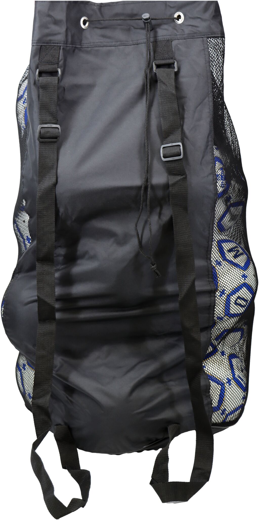 Helposti kannettava vahvarakenteinen pallosäkki kahdella olkahihnalla.