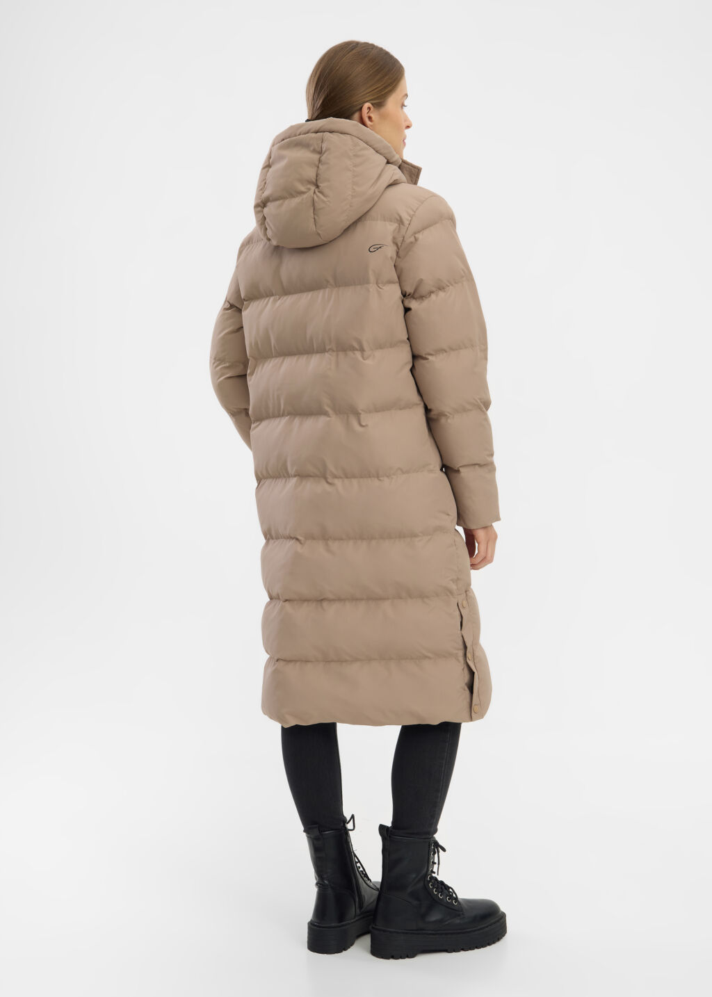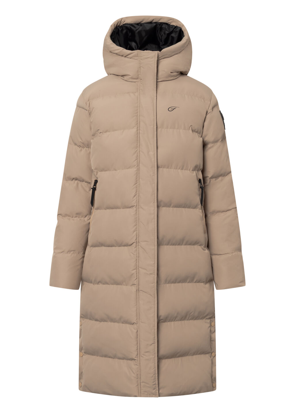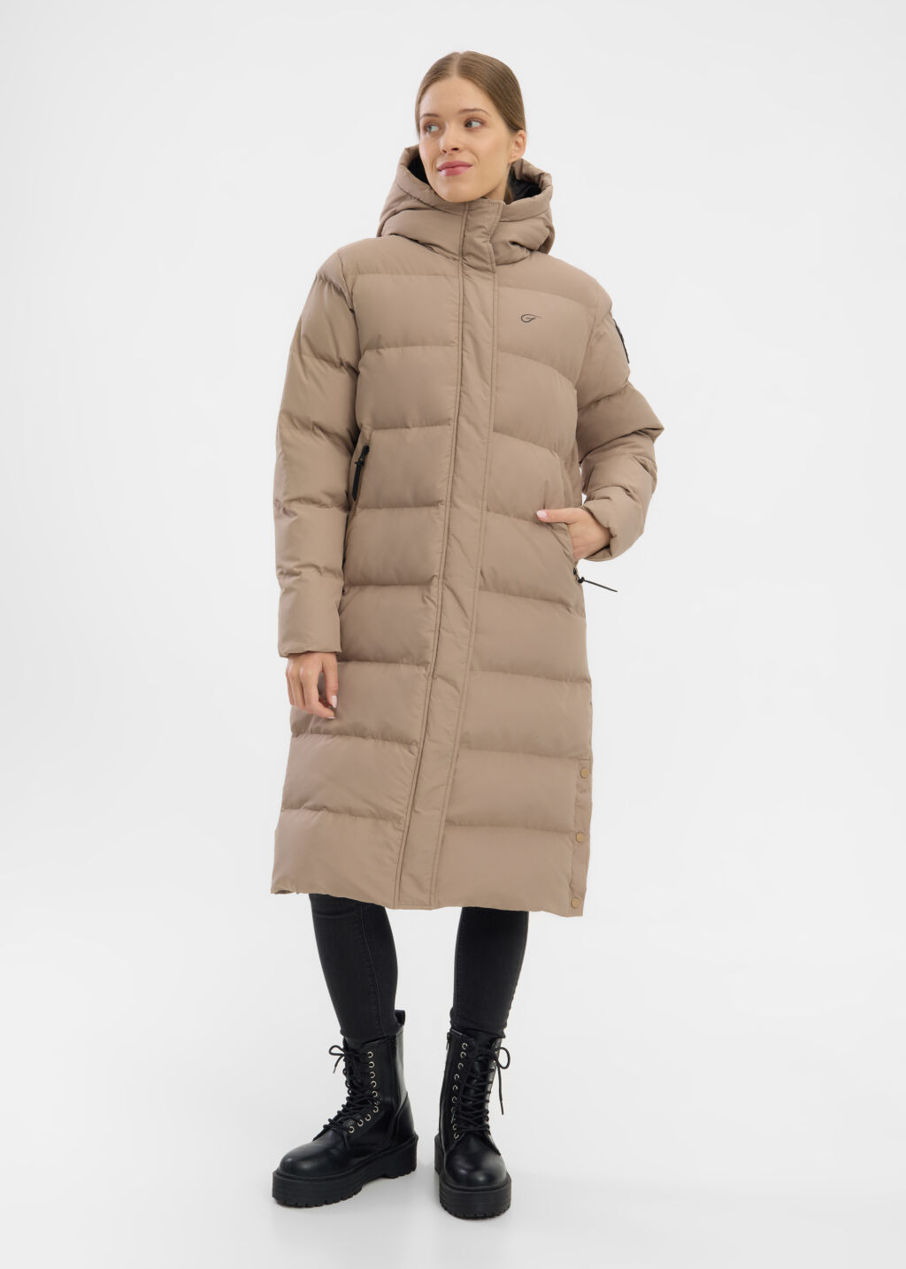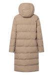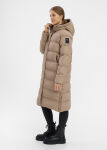 Naisten pitkä ja lämmin toppatakki, jossa on hyvin suojaava huppu ja vetoketjutaskut sivuilla.