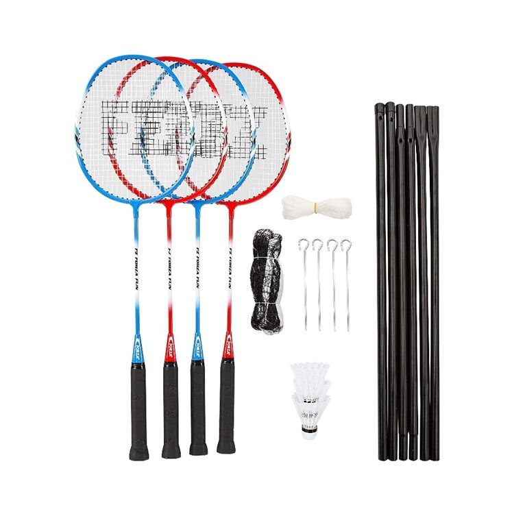 Täydellinen sulkapallosetti koko perheelle. Mukana tulevan verkon ansiosta pelikentän pystyttäminen on helppoa.