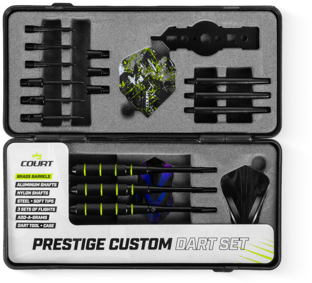 Court Prestige Custom Darts-setti on täydellinen ratkaisu pelaajille, jotka haluavat räätälöidä heittonsa täydellisesti omaan tyyliin ja peliympäristöön sopivaksi. Tämä kattava modulaarinen setti tarjoaa vertaansa vailla olevan joustavuuden ja kustomointimahdollisuudet sekä aloittelijoille että kehittyville pelaajieille.