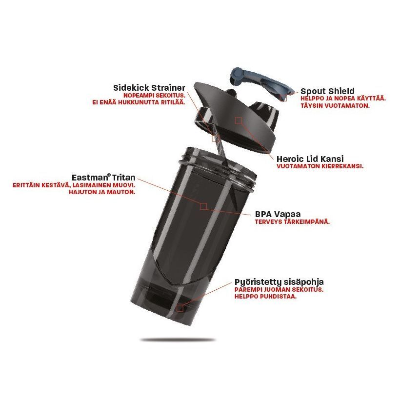 Shieldmixer shakerit ovat valmistettu paremmasta, premium-laatuisesta Eastman Tritan™ -materiaalista. Tritan on erittäin kestävää ja kirkasta, lasia muistuttavaa muovia, joka ei vaikuta veden makuun, eikä sisällä mitään vaarallisia BPA-aineita. Monet ominaisuudet kuten kanteen kiinnitetty sekoitusritilä, pyöristetty sisäpohja, sekä kääntökorkki helpottavat ja tehostavat urheilujuomien sekoittamista. Juomapullon voi pestä tiskikoneessa.