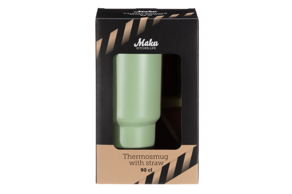 Reilunkokoinen termosmuki kannella ja pillillä. Tuplaseinämä pitää juoman lämpimänä/kylmänä. Valmistettu ruostumattomasta teräksestä. Vetoisuus 90 cl. Käsinpesu.