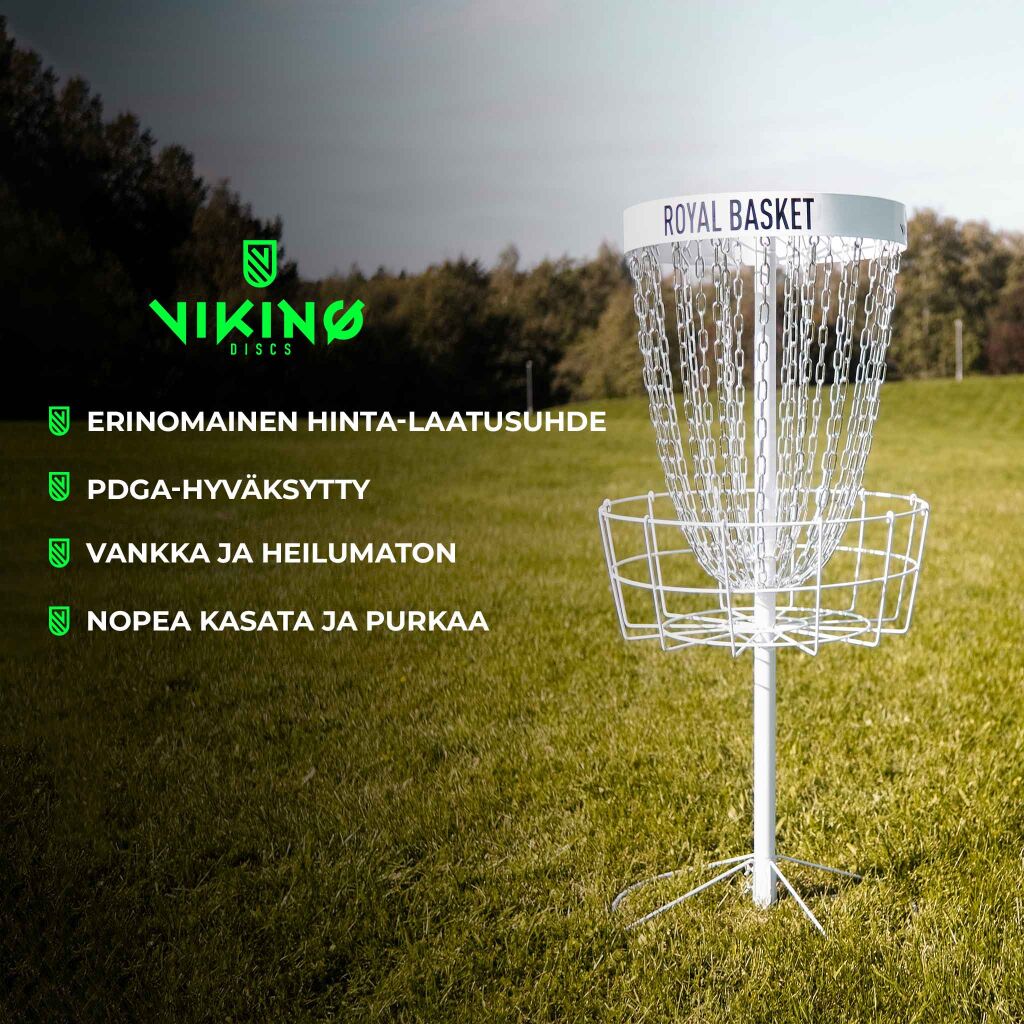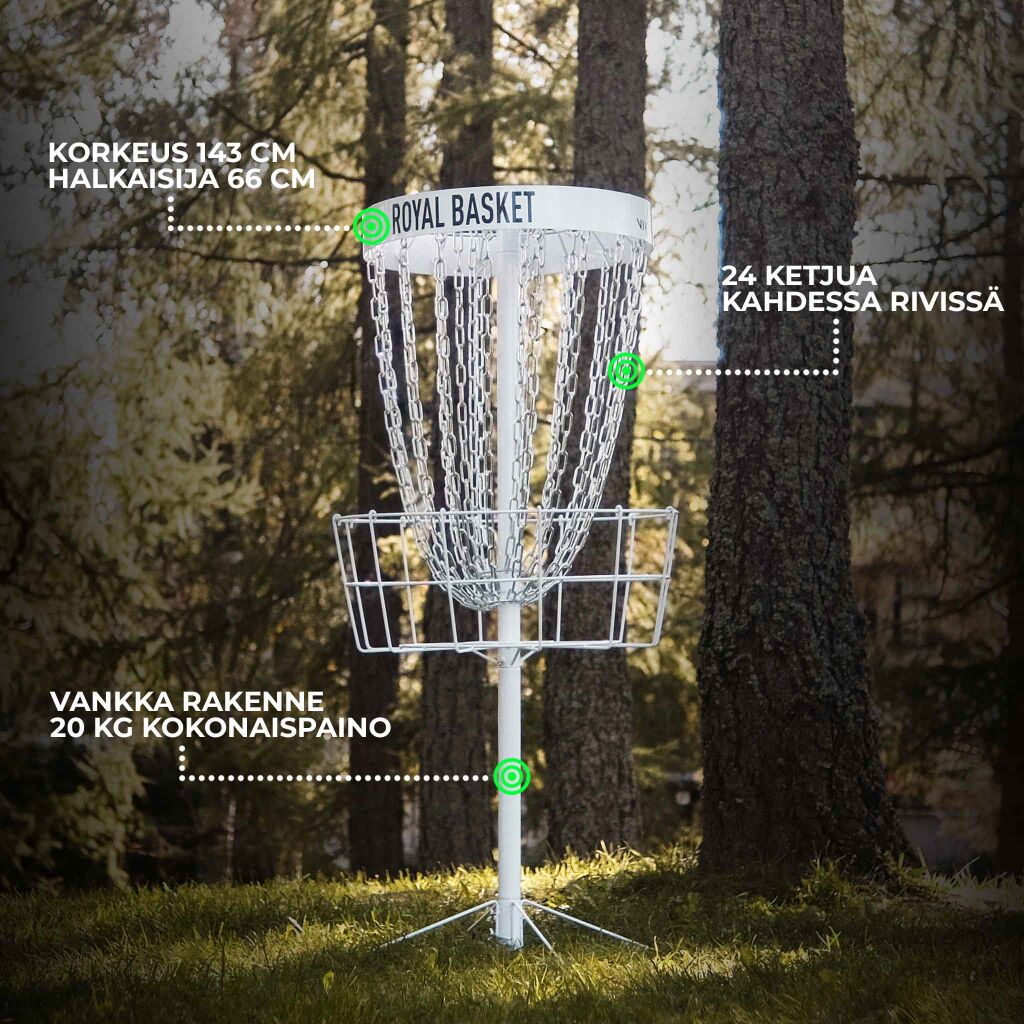 Kilpailutasoinen Royal Basket -frisbeegolfkori. Tällä PDGA:n (Professional Disc Golf Association) B-Tier kilpailuihin asti hyväksytyllä korilla viet lähiympäristössä treenaamisen seuraavalle tasolle. Kori soveltuu loistavasti esim. piha, koulu, leirintäalueiden ja liikkuvien ratojen käyttöön.
